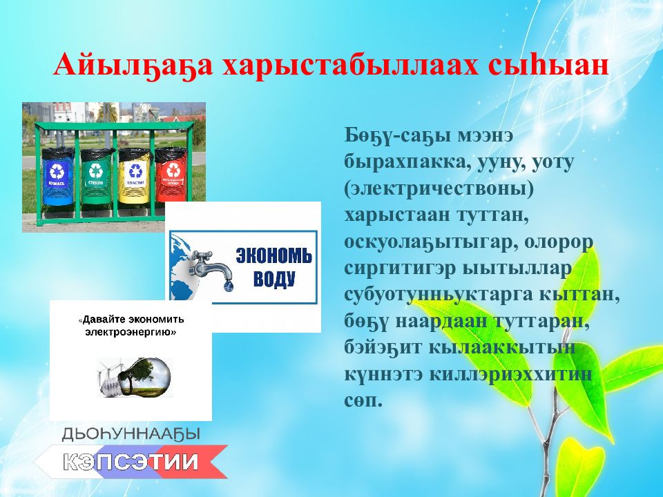 Б өҕү-саҕы мээнэ бырахпакка, ууну, уоту (электричествоны) харыстаан туттан, оскуолаҕытыгар, олорор сиргитигэр ыытыллар субуотунньуктарга кыттан, бөҕү наардаан туттаран, бэйэҕит кылааккытын күннэтэ киллэриэххитин сөп.