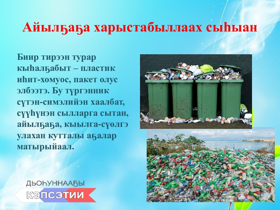 Биир тирээн турар кыһалҕабыт – пластик иһит-хомуос, пакет олус элбээтэ. Бу түргэнник сүтэн-симэлийэн хаалбат, сүүһүнэн сылларга сытан, айылҕаҕа, кыылга-сүөлгэ улахан кутталы аҕалар матырыйаал.