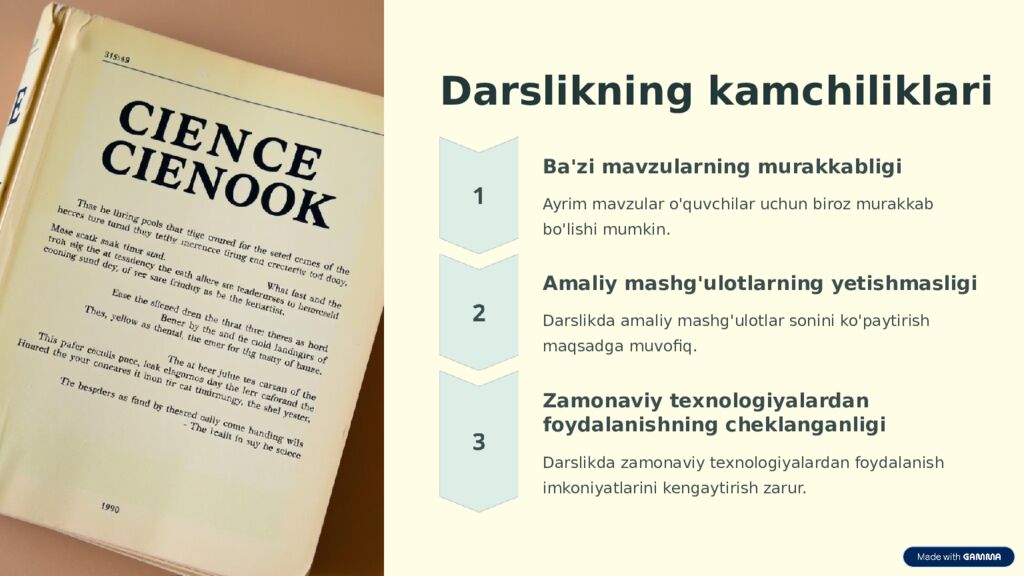 Darslikning kamchiliklari Ba'zi mavzularning murakkabligi Ayrim mavzular o'quvchilar uchun biroz murakkab bo'lishi mumkin. Amaliy mashg'ulotlarning yetishmasligi Darslikda amaliy mashg'ulotlar sonini ko'paytirish maqsadga muvofiq. Zamonaviy texnologiyalardan foydalanishning cheklanganligi Darslikda zamonaviy texnologiyalardan foydalanish imkoniyatlarini kengaytirish zarur.