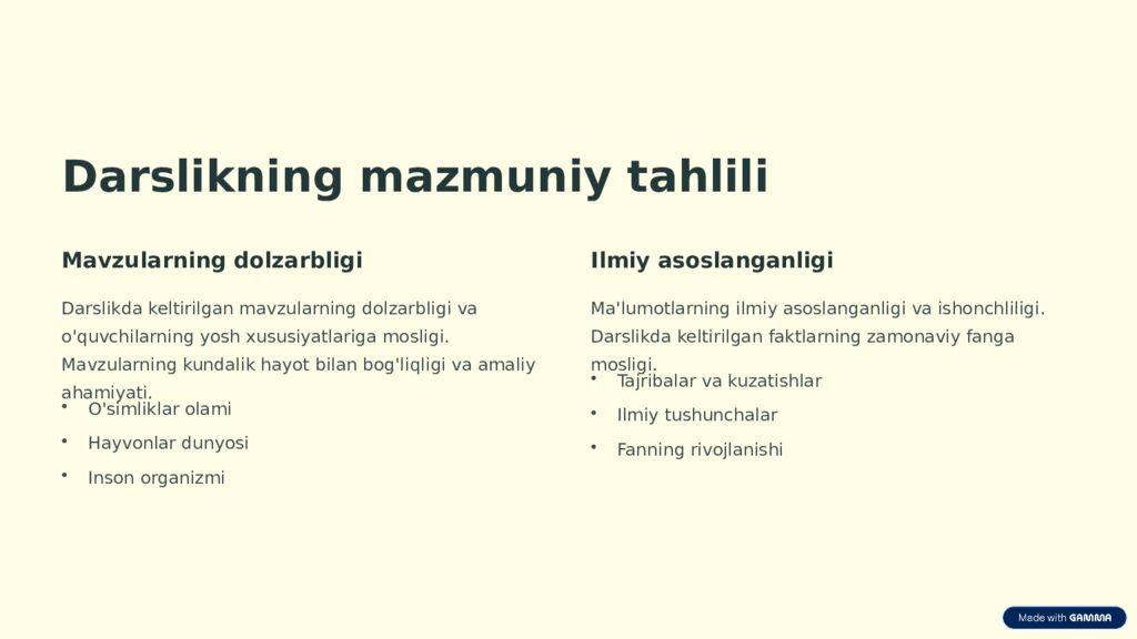 Darslikning mazmuniy tahlili Mavzularning dolzarbligi Darslikda keltirilgan mavzularning dolzarbligi va o'quvchilarning yosh xususiyatlariga mosligi. Mavzularning kundalik hayot bilan bog'liqligi va amaliy ahamiyati. O'simliklar olami Hayvonlar dunyosi Inson organizmi Ilmiy asoslanganligi Ma'lumotlarning ilmiy asoslanganligi va ishonchliligi. Darslikda keltirilgan faktlarning zamonaviy fanga mosligi. Tajribalar va kuzatishlar Ilmiy tushunchalar Fanning rivojlanishi
