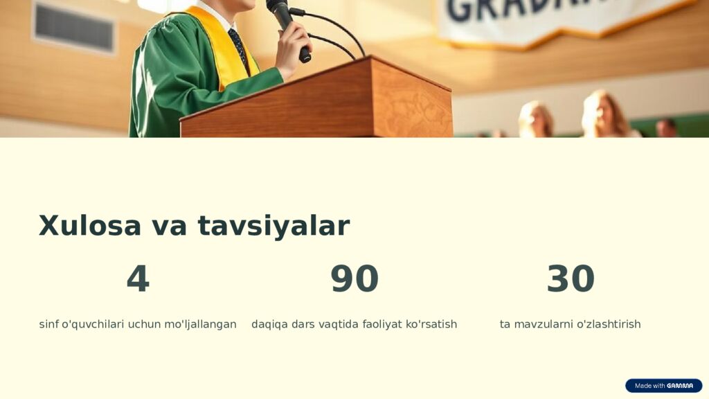Xulosa va tavsiyalar 4 sinf o'quvchilari uchun mo'ljallangan 90 daqiqa dars vaqtida faoliyat ko'rsatish 30 ta mavzularni o'zlashtirish
