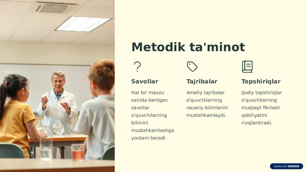 Metodik ta'minot Savollar Har bir mavzu oxirida berilgan savollar o'quvchilarning bilimini mustahkamlashga yordam beradi. Tajribalar Amaliy tajribalar o'quvchilarning nazariy bilimlarini mustahkamlaydi. Topshiriqlar Ijodiy topshiriqlar o'quvchilarning mustaqil fikrlash qobiliyatini rivojlantiradi.