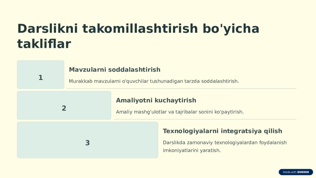 Darslikni takomillashtirish bo'yicha takliflar 1 Mavzularni soddalashtirish Murakkab mavzularni o'quvchilar tushunadigan tarzda soddalashtirish. 2 Amaliyotni kuchaytirish Amaliy mashg'ulotlar va tajribalar sonini ko'paytirish. 3 Texnologiyalarni integratsiya qilish Darslikda zamonaviy texnologiyalardan foydalanish imkoniyatlarini yaratish.