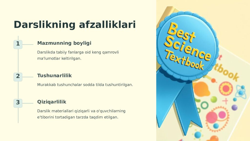 Darslikning afzalliklari 1 Mazmunning boyligi Darslikda tabiiy fanlarga oid keng qamrovli ma'lumotlar keltirilgan. 2 Tushunarlilik Murakkab tushunchalar sodda tilda tushuntirilgan. 3 Qiziqarlilik Darslik materiallari qiziqarli va o'quvchilarning e'tiborini tortadigan tarzda taqdim etilgan.