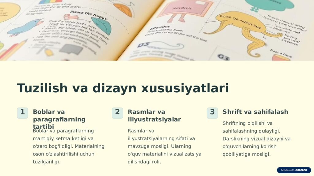 Tuzilish va dizayn xususiyatlari 1 Boblar va paragraflarning tartibi Boblar va paragraflarning mantiqiy ketma-ketligi va o'zaro bog'liqligi. Materialning oson o'zlashtirilishi uchun tuzilganligi. 2 Rasmlar va illyustratsiyalar Rasmlar va illyustratsiyalarning sifati va mavzuga mosligi. Ularning o'quv materialini vizualizatsiya qilishdagi roli. 3 Shrift va sahifalash Shriftning o'qilishi va sahifalashning qulayligi. Darslikning vizual dizayni va o'quvchilarning ko'rish qobiliyatiga mosligi.