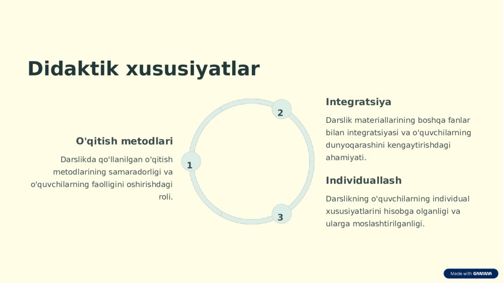 Didaktik xususiyatlar O'qitish metodlari Darslikda qo'llanilgan o'qitish metodlarining samaradorligi va o'quvchilarning faolligini oshirishdagi roli. 1 Integratsiya Darslik materiallarining boshqa fanlar bilan integratsiyasi va o'quvchilarning dunyoqarashini kengaytirishdagi ahamiyati. 2 Individuallash Darslikning o'quvchilarning individual xususiyatlarini hisobga olganligi va ularga moslashtirilganligi. 3