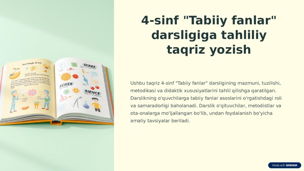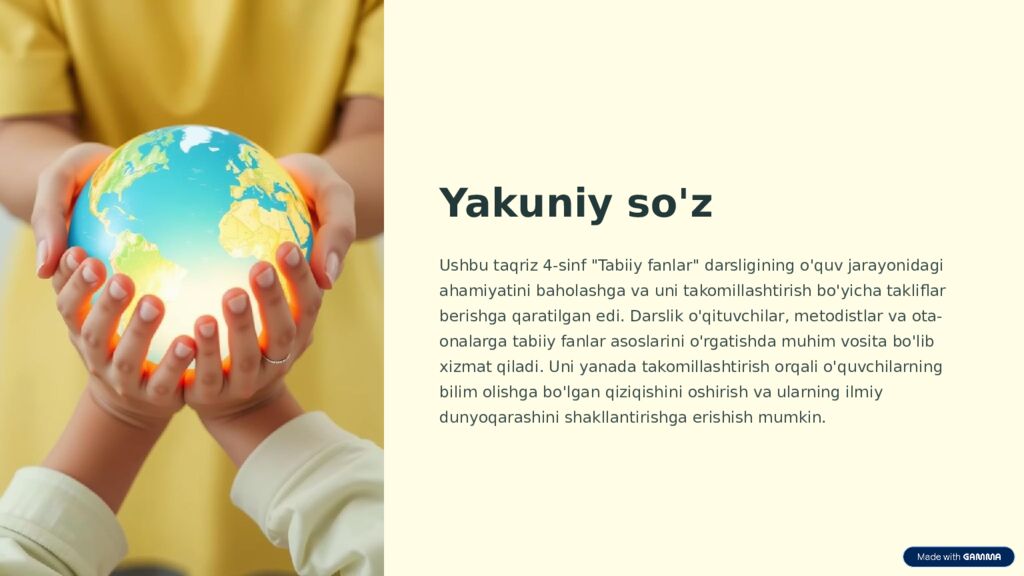 Yakuniy so'z Ushbu taqriz 4-sinf "Tabiiy fanlar" darsligining o'quv jarayonidagi ahamiyatini baholashga va uni takomillashtirish bo'yicha takliflar berishga qaratilgan edi. Darslik o'qituvchilar, metodistlar va ota-onalarga tabiiy fanlar asoslarini o'rgatishda muhim vosita bo'lib xizmat qiladi. Uni yanada takomillashtirish orqali o'quvchilarning bilim olishga bo'lgan qiziqishini oshirish va ularning ilmiy dunyoqarashini shakllantirishga erishish mumkin.