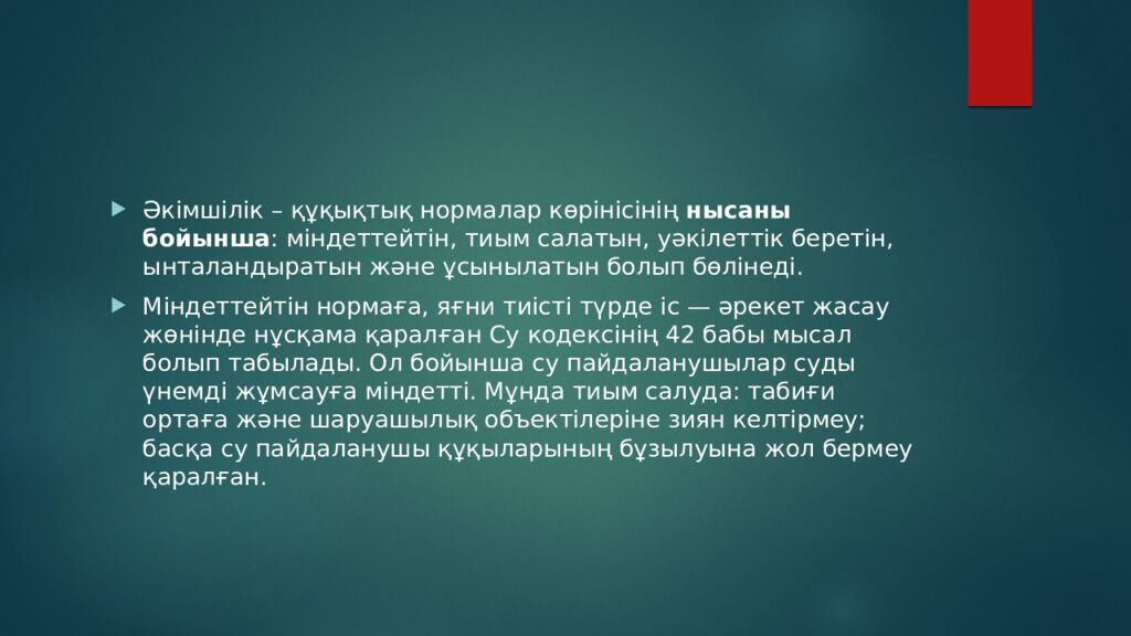 Әкімшілік – құқықтық нормалар көрінісінің нысаны бойынша : міндеттейтін, тиым салатын, уәкілеттік беретін, ынталандыратын және ұсынылатын болып бөлінеді. Міндеттейтін нормаға, яғни тиісті түрде іс — әрекет жасау жөнінде нұсқама қаралған Су кодексінің 42 бабы мысал болып табылады. Ол бойынша су пайдаланушылар суды үнемді жұмсауға міндетті. Мұнда тиым салуда : табиғи ортаға және шаруашылық объектілеріне зиян келтірмеу ; басқа су пайдаланушы құқыларының бұзылуына жол бермеу қаралған.