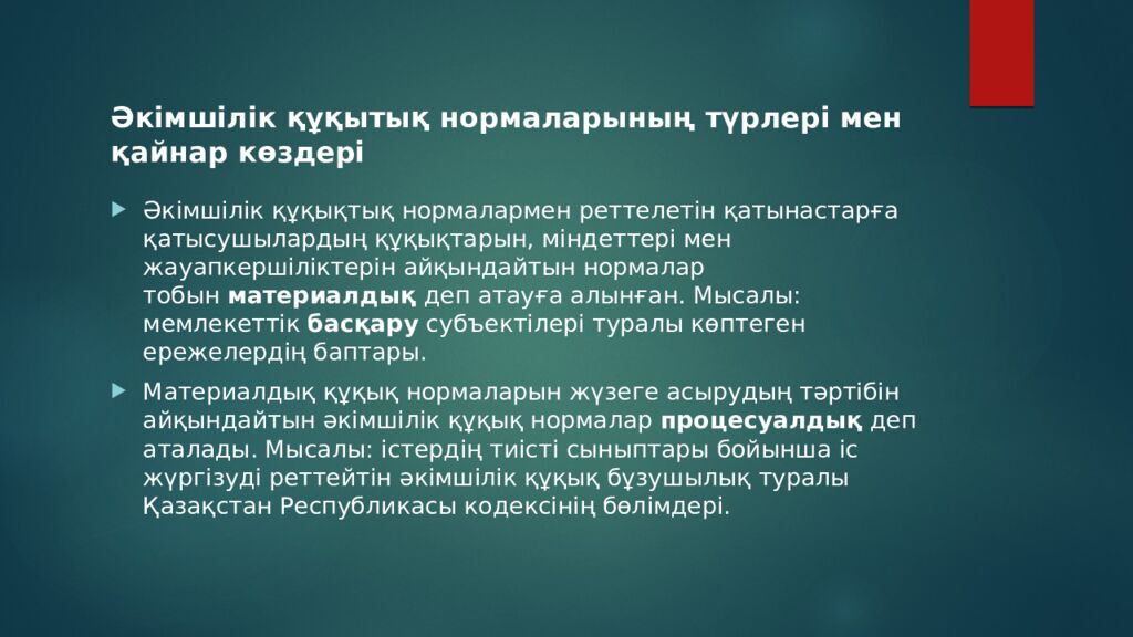 Слайд 10: Әкімшілік құқытық нормаларының түрлері мен қайнар көздері