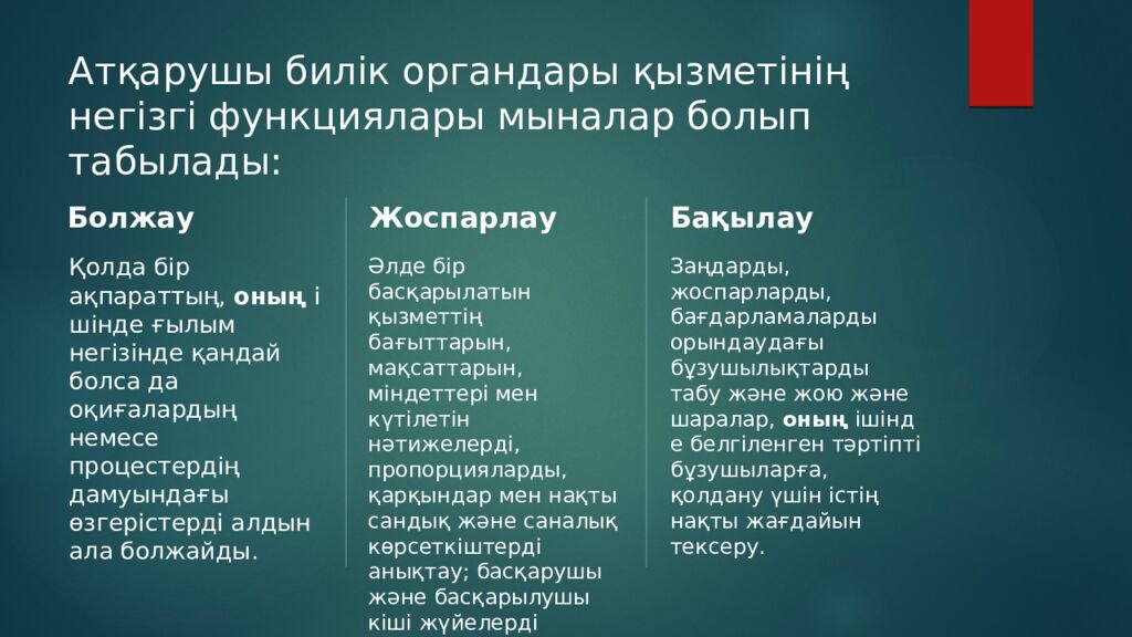 Слайд 8: Атқарушы билік органдары қызметінің негізгі функциялары мыналар болып табылады :