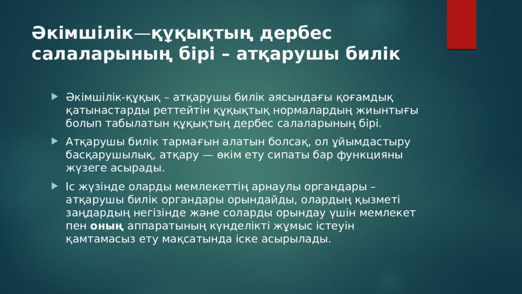 Слайд 7: Әкімшілік — құқықтың дербес салаларының бірі – атқарушы билік