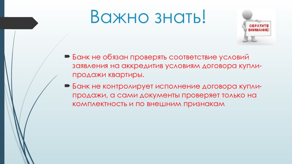 Банк не обязан проверять соответствие условий заявления на аккредитив условиям договора купли-продажи квартиры. Банк не контролирует исполнение договора купли-продажи, а сами документы проверяет только на комплектность и по внешним признакам