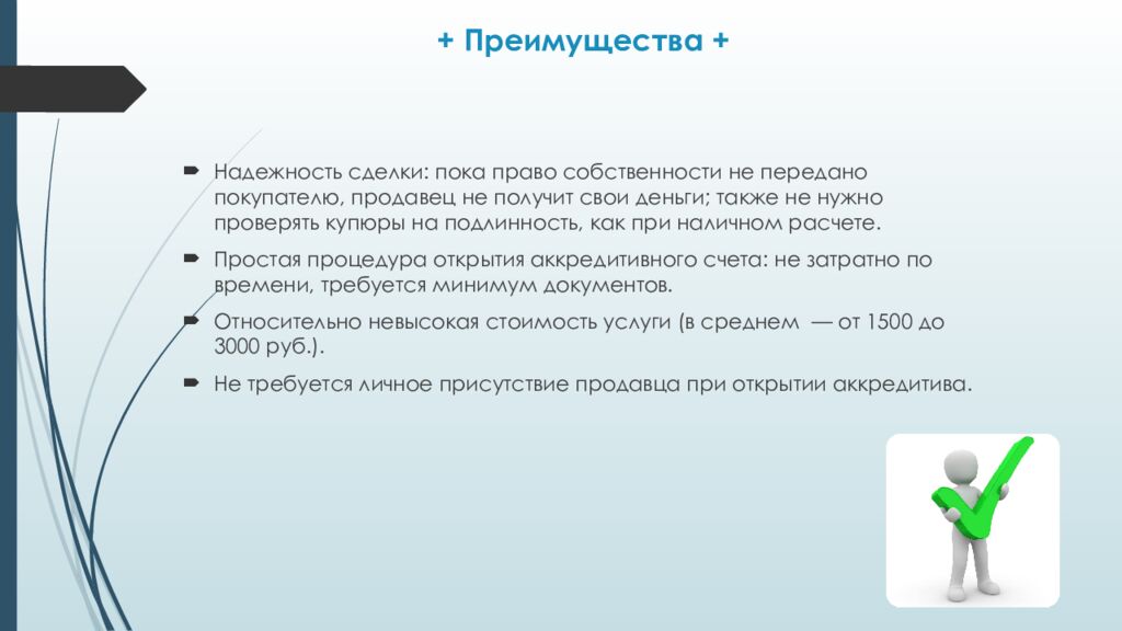 Надежность сделки: пока право собственности не передано покупателю, продавец не получит свои деньги; также не нужно проверять купюры на подлинность, как при наличном расчете. Простая процедура открытия аккредитивного счета: не затратно по времени, требуется минимум документов. Относительно невысокая стоимость услуги (в среднем — от 1500 до 3000 руб.). Не требуется личное присутствие продавца при открытии аккредитива.
