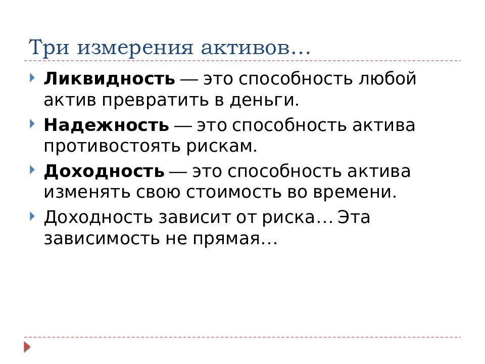 Ликвидность — это способность любой актив превратить в деньги. Надежность — это способность актива противостоять рискам. Доходность — это способность актива изменять свою стоимость во времени. Доходность зависит от риска… Эта зависимость не прямая…