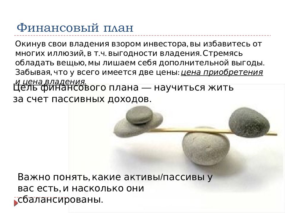Окинув свои владения взором инвестора, вы избавитесь от многих иллюзий, в т.ч. выгодности владения. Стремясь обладать вещью, мы лишаем себя дополнительной выгоды. Забывая, что у всего имеется две цены: цена приобретения и цена владения. Цель финансового плана — научиться жить за счет пассивных доходов. Финансовый план Важно понять, какие активы/пассивы у вас есть, и насколько они сбалансированы.