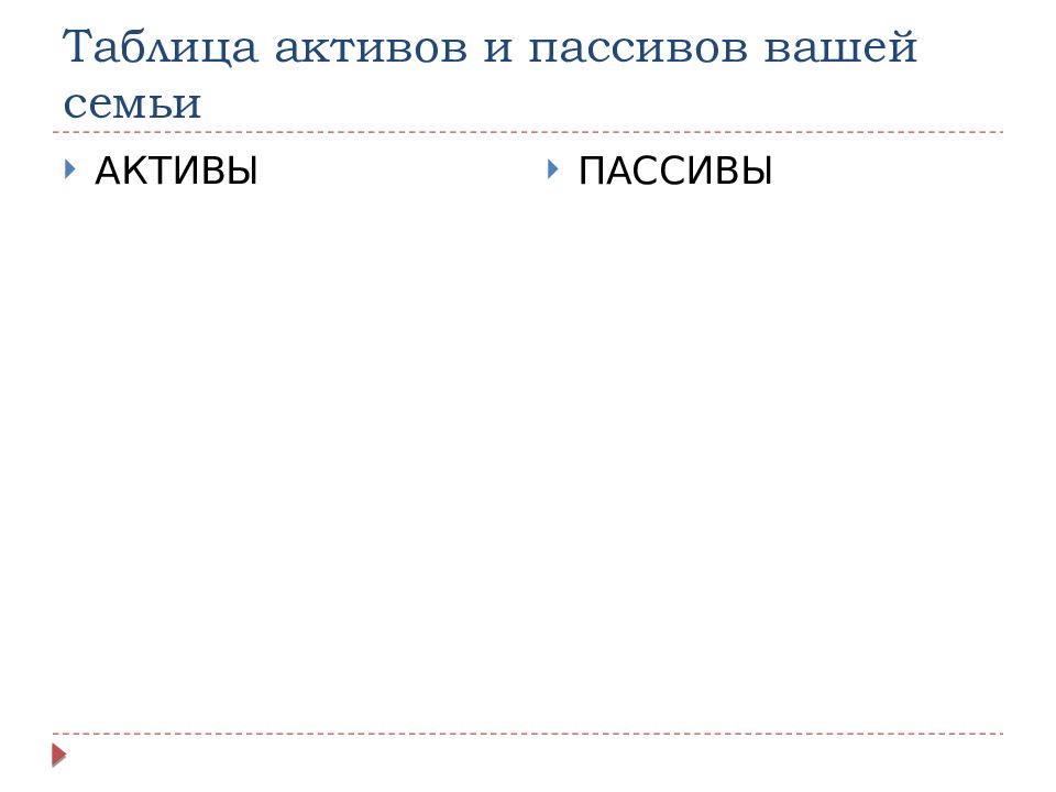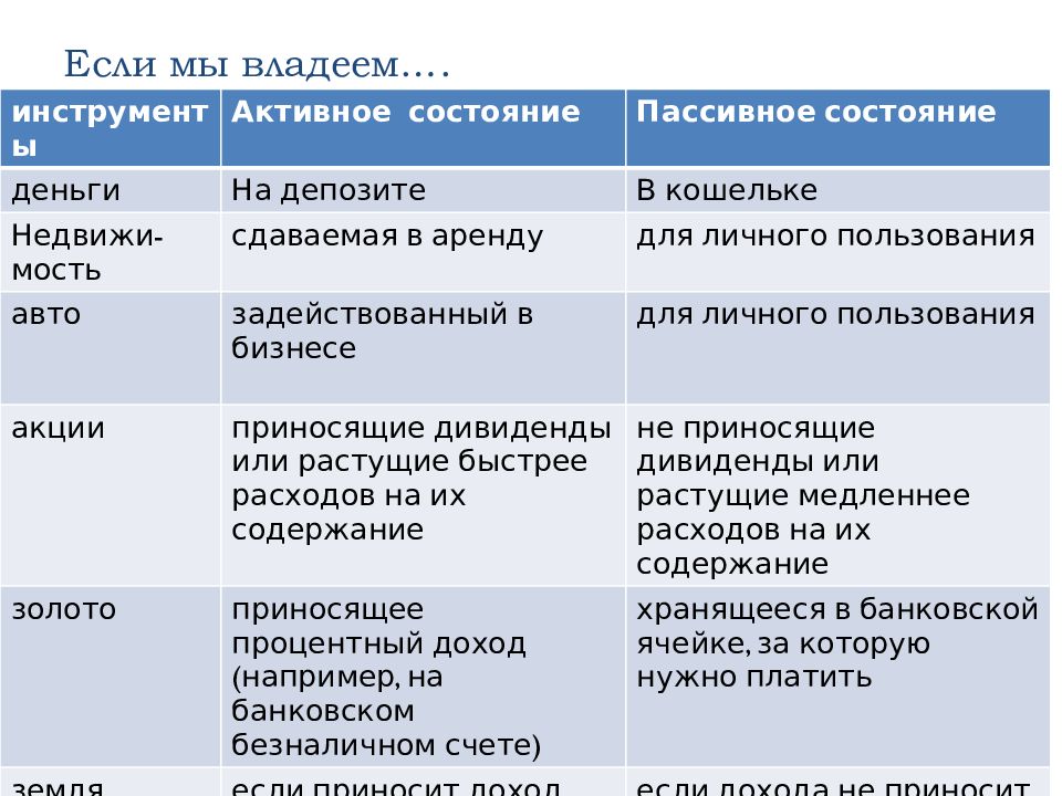 инструменты Активное состояние Пассивное состояние деньги На депозите В кошельке Недвижи- мость сдаваемая в аренду для личного пользования авто задействованный в бизнесе для личного пользования акции приносящие дивиденды или растущие быстрее расходов на их содержание не приносящие дивиденды или растущие медленнее расходов на их содержание золото приносящее процентный доход (например, на банковском безналичном счете) хранящееся в банковской ячейке, за которую нужно платить земля если приносит доход ( аренда) если дохода не приносит знания если приносят доход если за них заплачено, но дохода они не дают