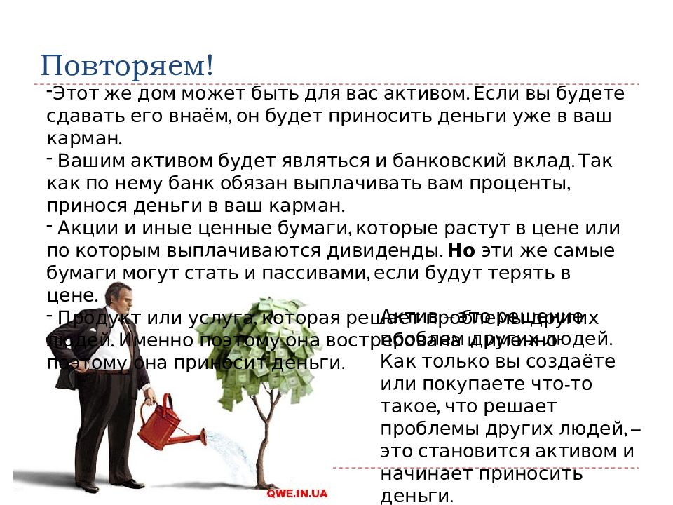 Этот же дом может быть для вас активом. Если вы будете сдавать его внаём, он будет приносить деньги уже в ваш карман. Вашим активом будет являться и банковский вклад. Так как по нему банк обязан выплачивать вам проценты, принося деньги в ваш карман. Акции и иные ценные бумаги, которые растут в цене или по которым выплачиваются дивиденды. Но эти же самые бумаги могут стать и пассивами, если будут терять в цене. Продукт или услуга, которая решает проблемы других людей. Именно поэтому она востребована и именно поэтому она приносит деньги. Актив – это решение проблем других людей. Как только вы создаёте или покупаете что-то такое, что решает проблемы других людей, – это становится активом и начинает приносить деньги. Повторяем!