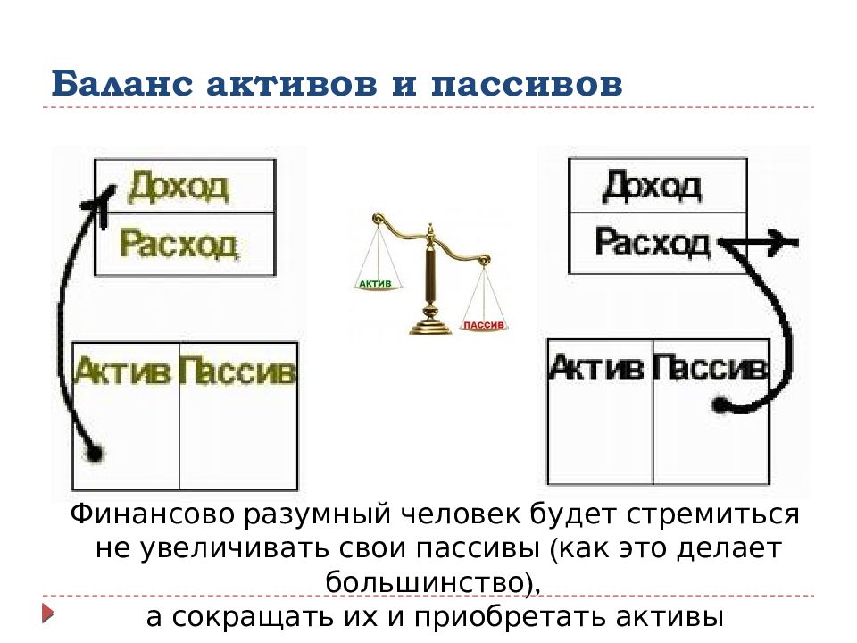 Баланс активов и пассивов Финансово разумный человек будет стремиться не увеличивать свои пассивы (как это делает большинство), а сокращать их и приобретать активы