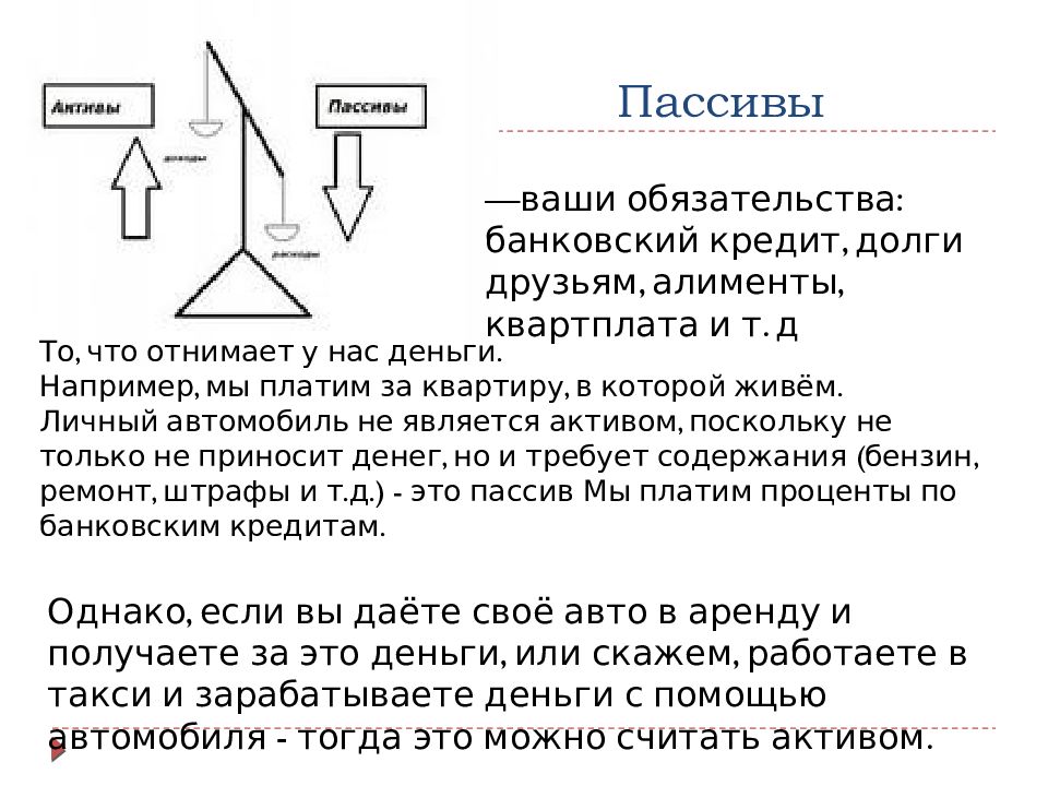 То, что отнимает у нас деньги. Например, мы платим за квартиру, в которой живём. Личный автомобиль не является активом, поскольку не только не приносит денег, но и требует содержания (бензин, ремонт, штрафы и т.д.) - это пассив Мы платим проценты по банковским кредитам. Пассивы Однако, если вы даёте своё авто в аренду и получаете за это деньги, или скажем, работаете в такси и зарабатываете деньги с помощью автомобиля - тогда это можно считать активом. —ваши обязательства: банковский кредит, долги друзьям, алименты, квартплата и т. д