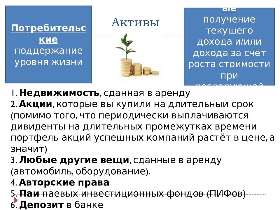 1. Недвижимость, сданная в аренду 2. Акции, которые вы купили на длительный срок (помимо того, что периодически выплачиваются дивиденты на длительных промежутках времени портфель акций успешных компаний растёт в цене, а значит) 3. Любые другие вещи, сданные в аренду (автомобиль, оборудование). 4. Авторские права 5. Паи паевых инвестиционных фондов ( ПИФов ) 6. Депозит в банке Активы Потребительские поддержание уровня жизни Инвестиционные получение текущего дохода и/или дохода за счет роста стоимости при последующей продаже