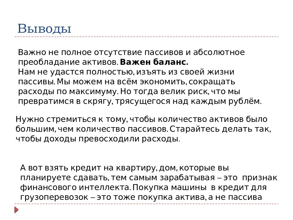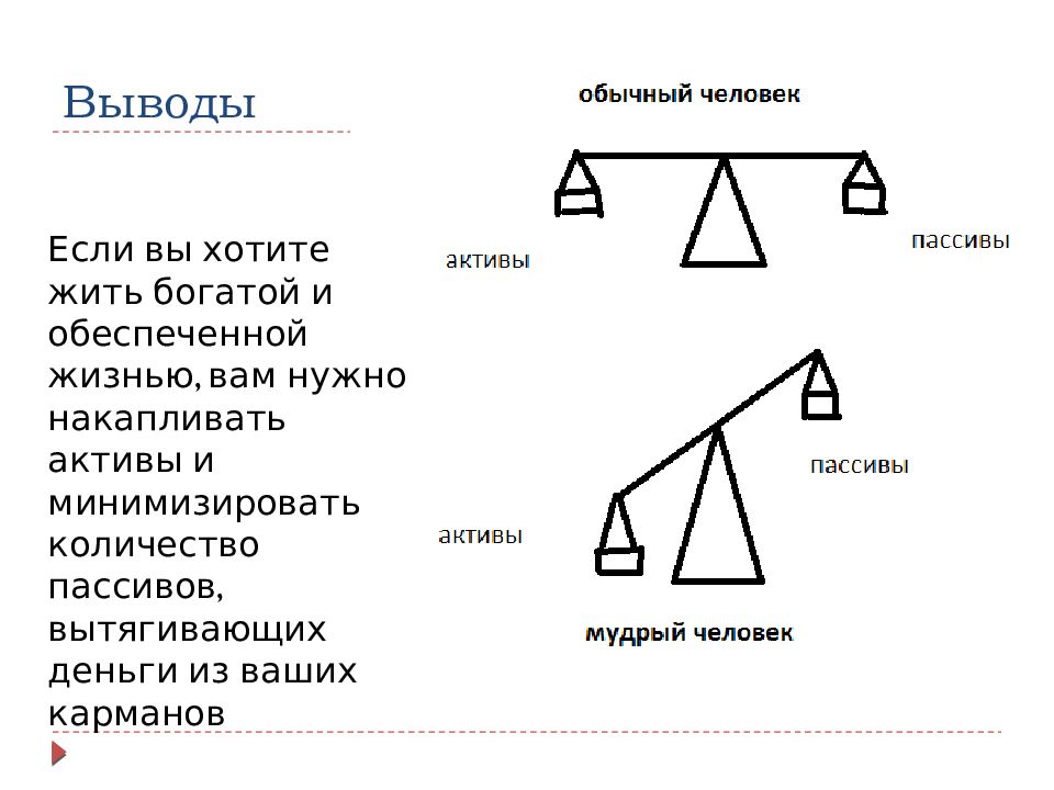Важно не полное отсутствие пассивов и абсолютное преобладание активов. Важен баланс. Нам не удастся полностью, изъять из своей жизни пассивы. Мы можем на всём экономить, сокращать расходы по максимуму. Но тогда велик риск, что мы превратимся в скрягу, трясущегося над каждым рублём. Нужно стремиться к тому, чтобы количество активов было большим, чем количество пассивов. Старайтесь делать так, чтобы доходы превосходили расходы. А вот взять кредит на квартиру, дом, которые вы планируете сдавать, тем самым зарабатывая – это признак финансового интеллекта. Покупка машины в кредит для грузоперевозок – это тоже покупка актива, а не пассива