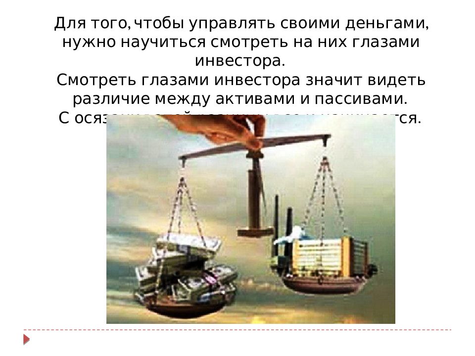 Для того, чтобы управлять своими деньгами, нужно научиться смотреть на них глазами инвестора. Смотреть глазами инвестора значит видеть различие между активами и пассивами. С осязания этой разницы все и начинается.