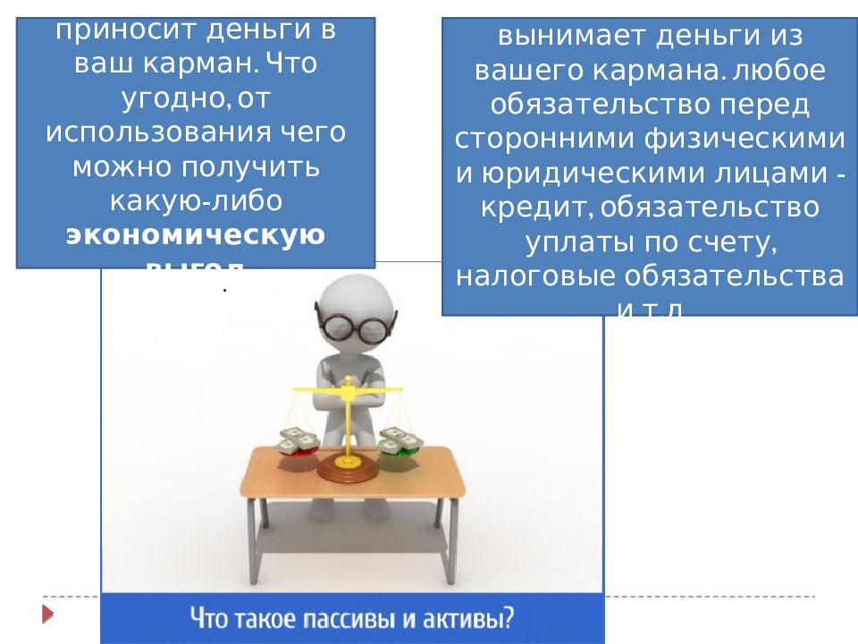 Активы - то, что приносит деньги в ваш карман. Что угодно, от использования чего можно получить какую-либо экономическую выгод Пассивы -то, что вынимает деньги из вашего кармана. любое обязательство перед сторонними физическими и юридическими лицами - кредит, обязательство уплаты по счету, налоговые обязательства и т.д .