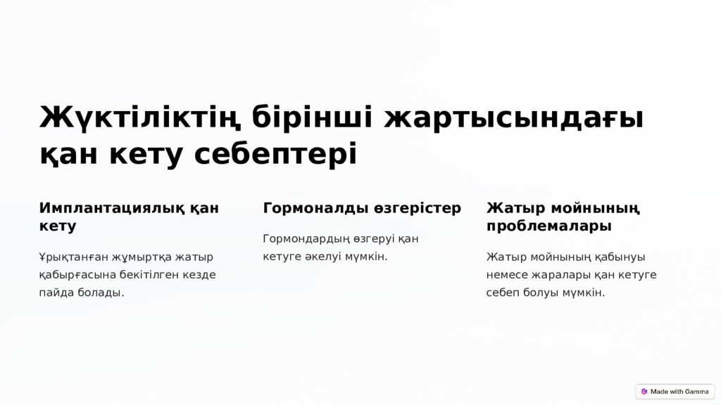 Жүктіліктің бірінші жартысындағы қан кету себептері Имплантациялық қан кету Ұрықтанған жұмыртқа жатыр қабырғасына бекітілген кезде пайда болады. Гормоналды өзгерістер Гормондардың өзгеруі қан кетуге әкелуі мүмкін. Жатыр мойнының проблемалары Жатыр мойнының қабынуы немесе жаралары қан кетуге себеп болуы мүмкін.