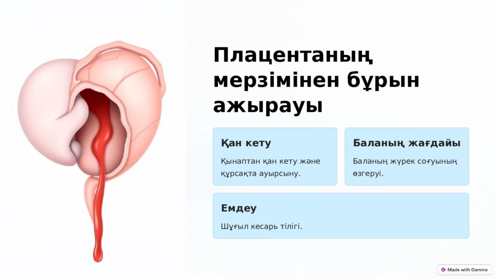 Плацентаның мерзімінен бұрын ажырауы Қан кету Қынаптан қан кету және құрсақта ауырсыну. Баланың жағдайы Баланың жүрек соғуының өзгеруі. Емдеу Шұғыл кесарь тілігі.