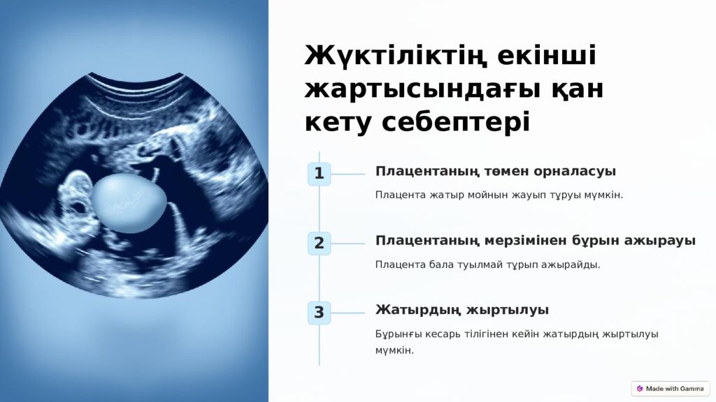 Жүктіліктің екінші жартысындағы қан кету себептері 1 Плацентаның төмен орналасуы Плацента жатыр мойнын жауып тұруы мүмкін. 2 Плацентаның мерзімінен бұрын ажырауы Плацента бала туылмай тұрып ажырайды. 3 Жатырдың жыртылуы Бұрынғы кесарь тілігінен кейін жатырдың жыртылуы мүмкін.