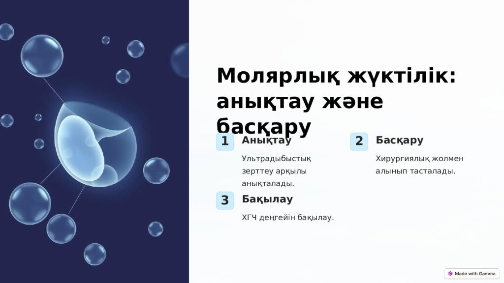 Молярлық жүктілік: анықтау және басқару 1 Анықтау Ультрадыбыстық зерттеу арқылы анықталады. 2 Басқару Хирургиялық жолмен алынып тасталады. 3 Бақылау ХГЧ деңгейін бақылау.