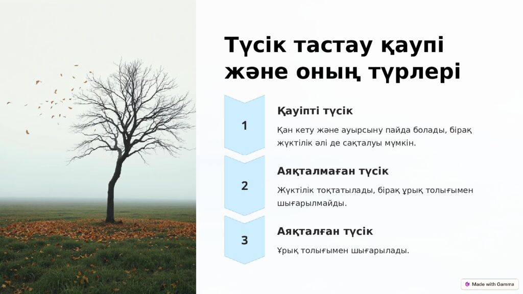 Түсік тастау қаупі және оның түрлері Қауіпті түсік Қан кету және ауырсыну пайда болады, бірақ жүктілік әлі де сақталуы мүмкін. Аяқталмаған түсік Жүктілік тоқтатылады, бірақ ұрық толығымен шығарылмайды. Аяқталған түсік Ұрық толығымен шығарылады.