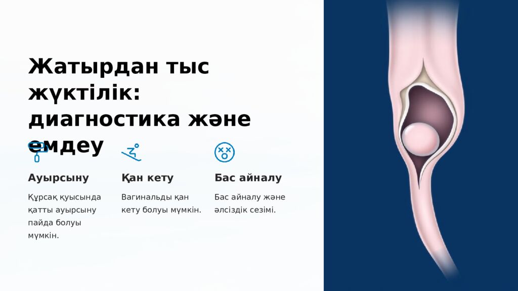 Жатырдан тыс жүктілік: диагностика және емдеу Ауырсыну Құрсақ қуысында қатты ауырсыну пайда болуы мүмкін. Қан кету Вагинальды қан кету болуы мүмкін. Бас айналу Бас айналу және әлсіздік сезімі.