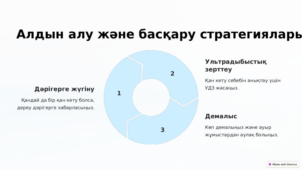 Алдын алу және басқару стратегиялары Дәрігерге жүгіну Қандай да бір қан кету болса, дереу дәрігерге хабарласыңыз. 1 Ультрадыбыстық зерттеу Қан кету себебін анықтау үшін УДЗ жасаңыз. 2 Демалыс Көп демалыңыз және ауыр жұмыстардан аулақ болыңыз. 3