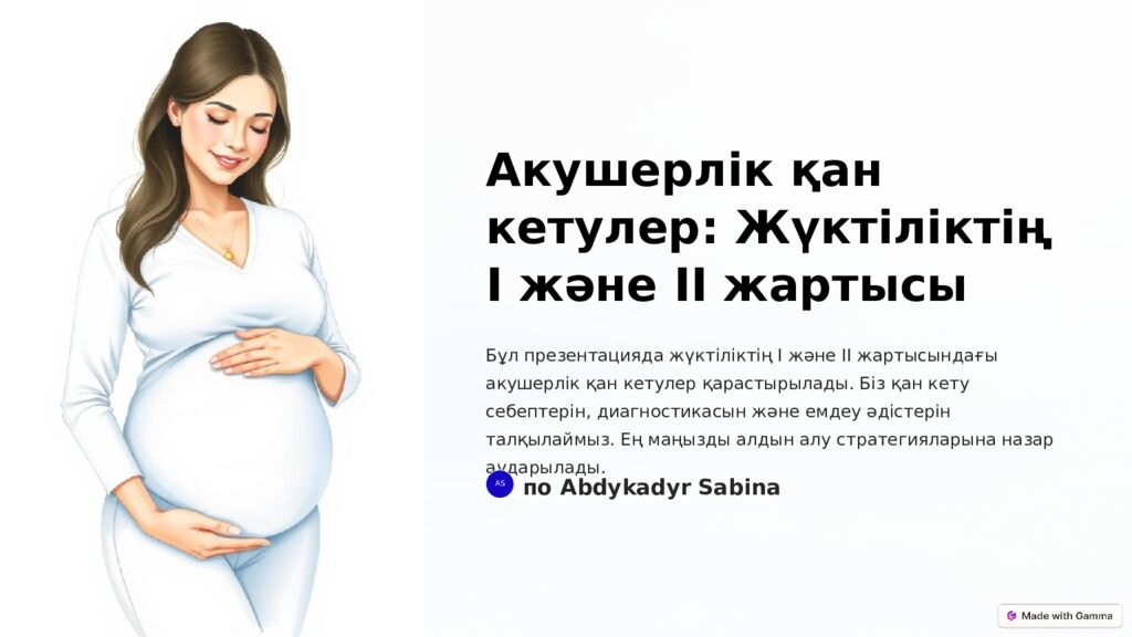 Акушерлік қан кетулер: Жүктіліктің I және II жартысы Бұл презентацияда жүктіліктің I және II жартысындағы акушерлік қан кетулер қарастырылады. Біз қан кету себептерін, диагностикасын және емдеу әдістерін талқылаймыз. Ең маңызды алдын алу стратегияларына назар аударылады. AS по Abdykadyr Sabina