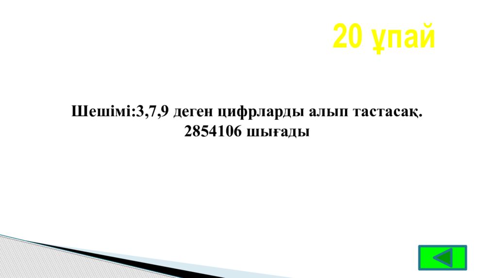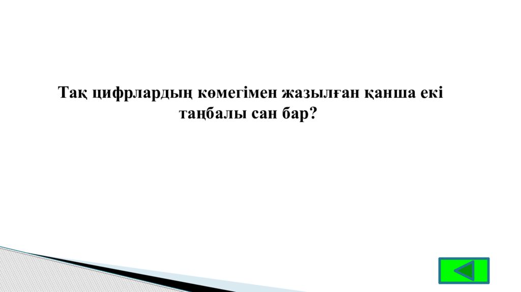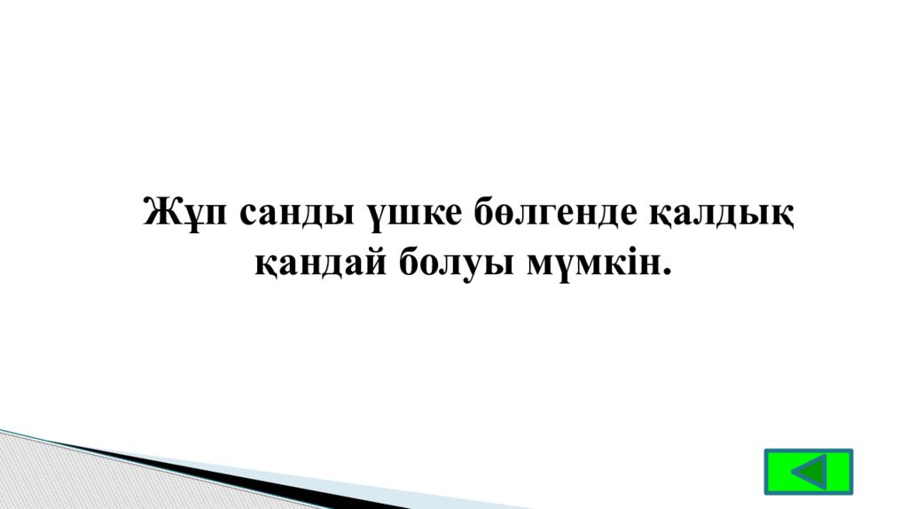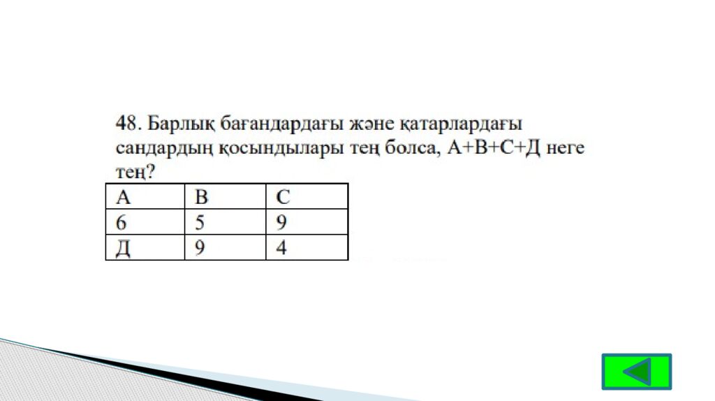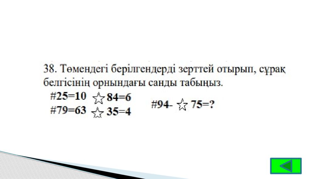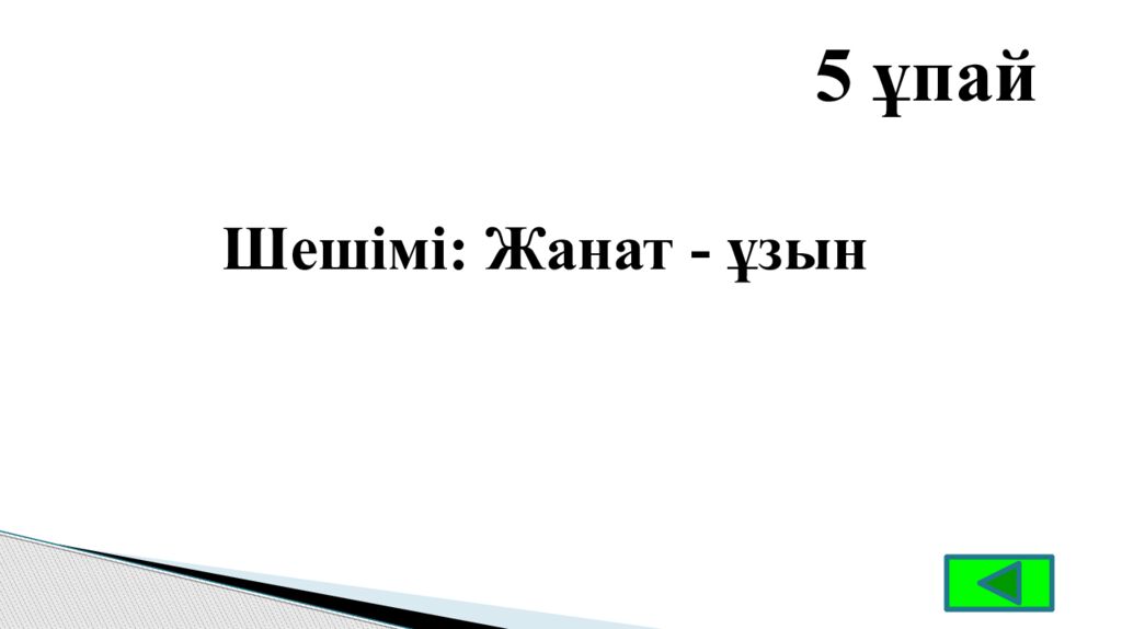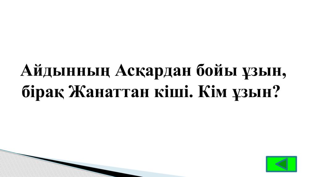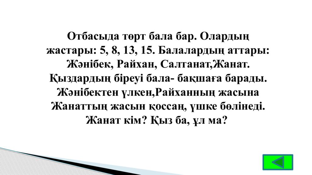 Отбасыда төрт бала бар. Олардың жастары : 5, 8, 13, 15. Балалардың аттары : Жәнібек, Райхан, Салтанат,Жанат. Қыздардың біреуі бала- бақшаға барады. Жәнібектен үлкен,Райханның жасына Жанаттың жасын қоссаң, үшке бөлінеді. Жанат кім ? Қыз ба, ұл ма ?