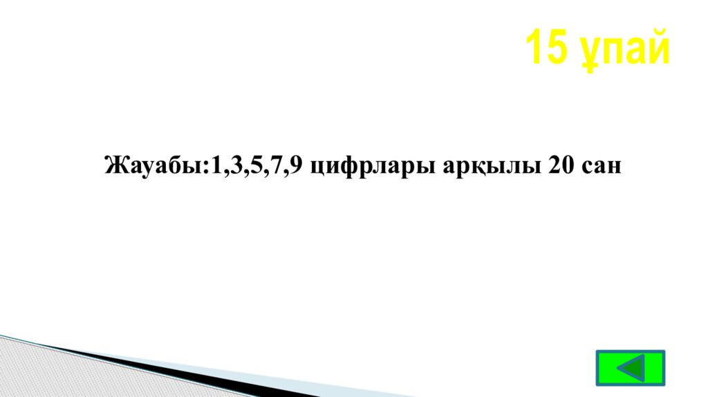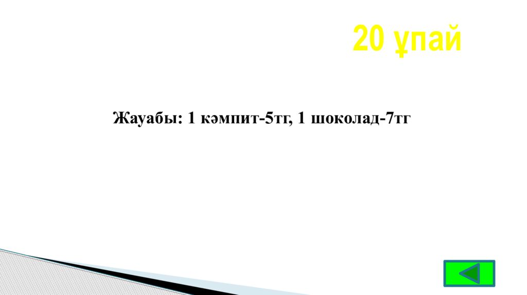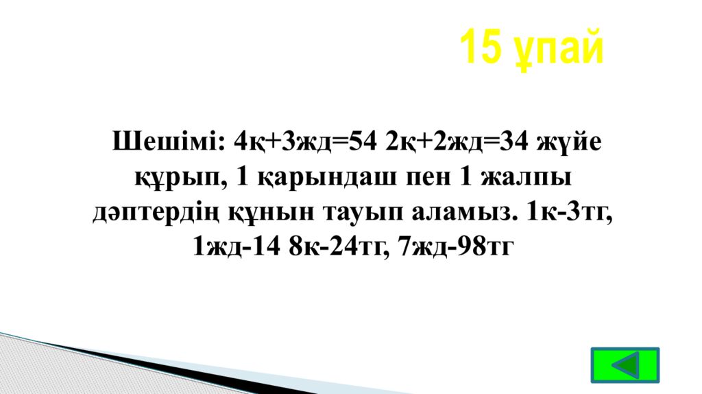 15 ұпай Шешімі : 4қ+3жд=54 2қ+2жд=34 жүйе құрып, 1 қарындаш пен 1 жалпы дәптердің құнын тауып аламыз. 1к-3тг, 1жд-14 8к-24тг, 7жд-98тг