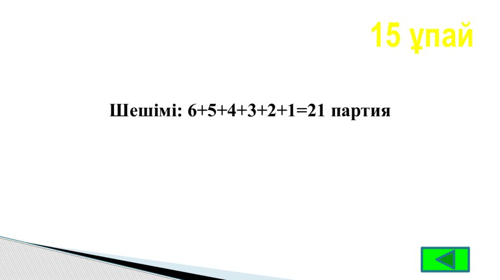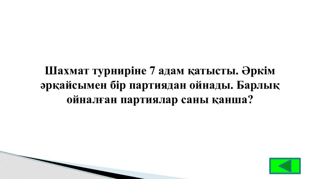 Шахмат турниріне 7 адам қатысты. Әркім әрқайсымен бір партиядан ойнады. Барлық ойналған партиялар саны қанша ?