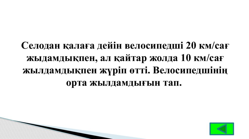 Селодан қалаға дейін велосипедші 20 км/ сағ жыдамдықпен, ал қайтар жолда 10 км/ сағ жылдамдықпен жүріп өтті. Велосипедшінің орта жылдамдығын тап.