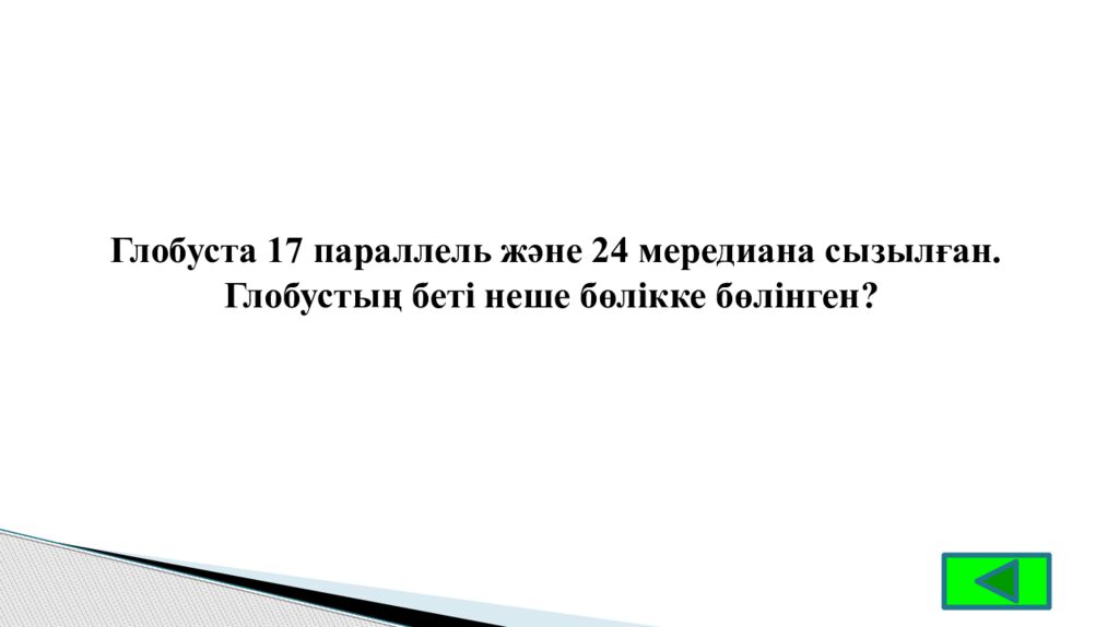 Глобуста 17 параллель және 24 мередиана сызылған. Глобустың беті неше бөлікке бөлінген ?
