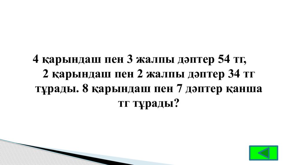 4 қарындаш пен 3 жалпы дәптер 54 тг, 2 қарындаш пен 2 жалпы дәптер 34 тг тұрады. 8 қарындаш пен 7 дәптер қанша тг тұрады ?