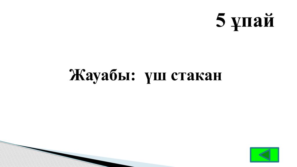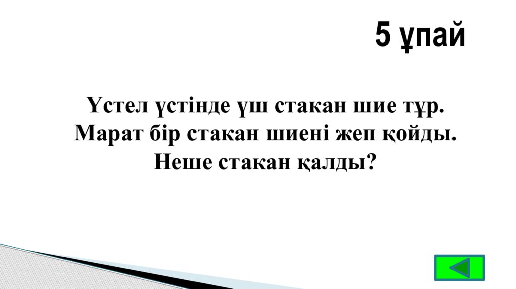 5 ұпай Үстел үстінде үш стакан шие тұр. Марат бір стакан шиені жеп қойды. Неше стакан қалды ?