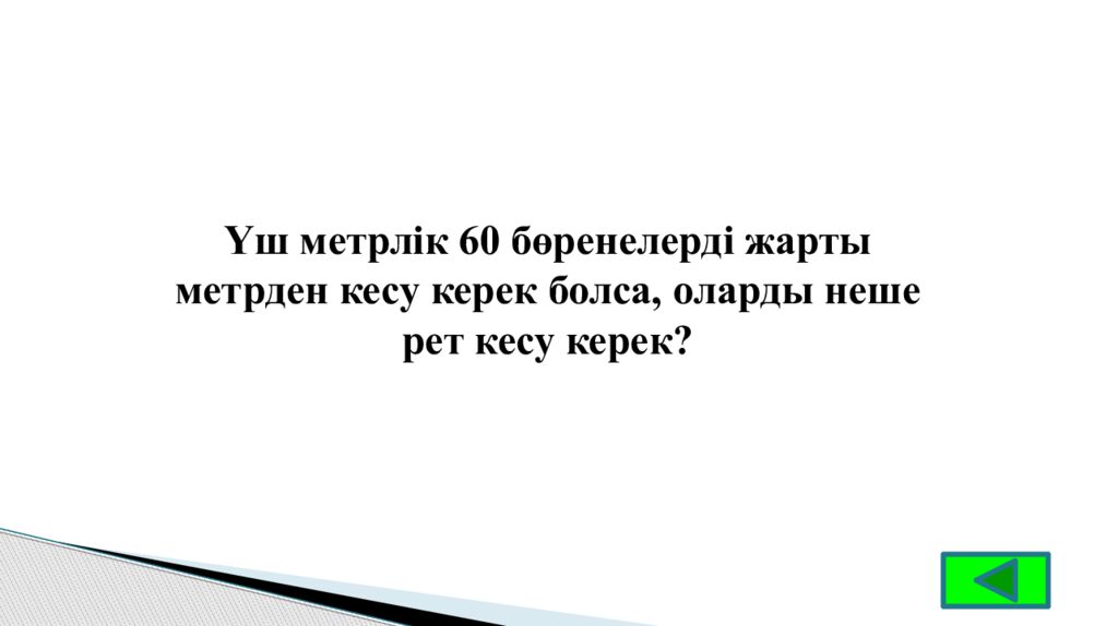 Үш метрлік 60 бөренелерді жарты метрден кесу керек болса, оларды неше рет кесу керек ?