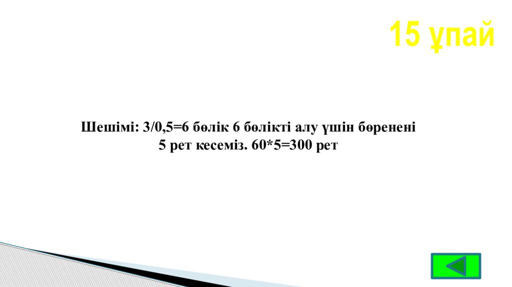 15 ұпай Египет Шешімі : 3/0,5=6 бөлік 6 бөлікті алу үшін бөренені 5 рет кесеміз. 60*5=300 рет