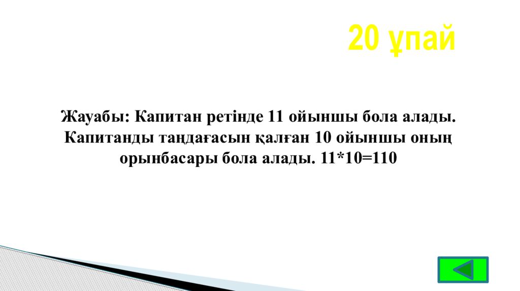 2 0 ұпай Жауабы : Капитан ретінде 11 ойыншы бола алады. Капитанды таңдағасын қалған 10 ойыншы оның орынбасары бола алады. 11*10=110