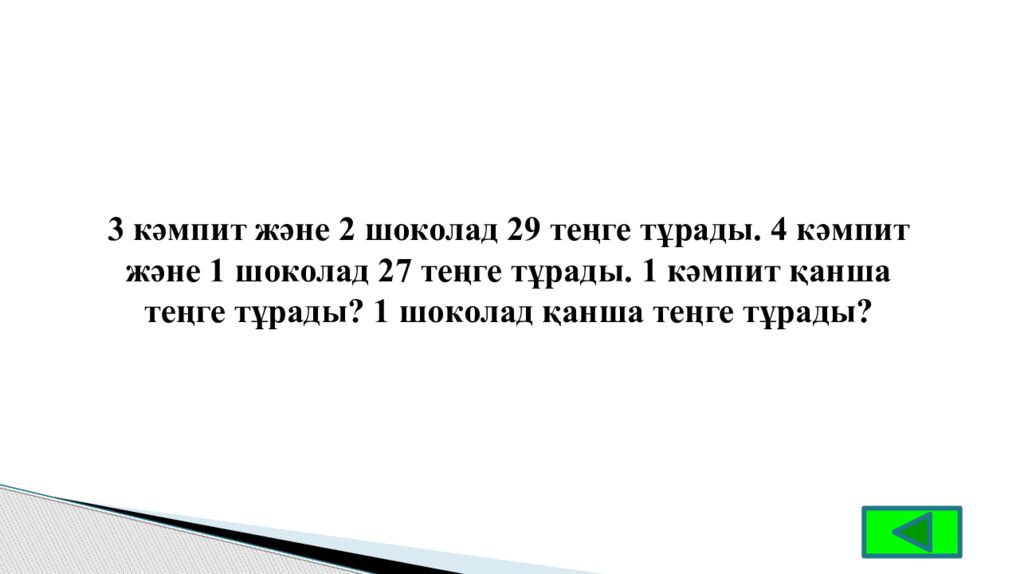 3 кәмпит және 2 шоколад 29 теңге тұрады. 4 кәмпит және 1 шоколад 27 теңге тұрады. 1 кәмпит қанша теңге тұрады ? 1 шоколад қанша теңге тұрады ?