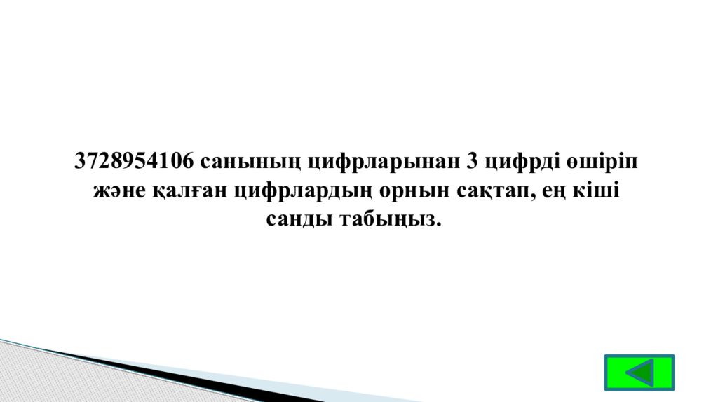 3728954106 санының цифрларынан 3 цифрді өшіріп және қалған цифрлардың орнын сақтап, ең кіші санды табыңыз.