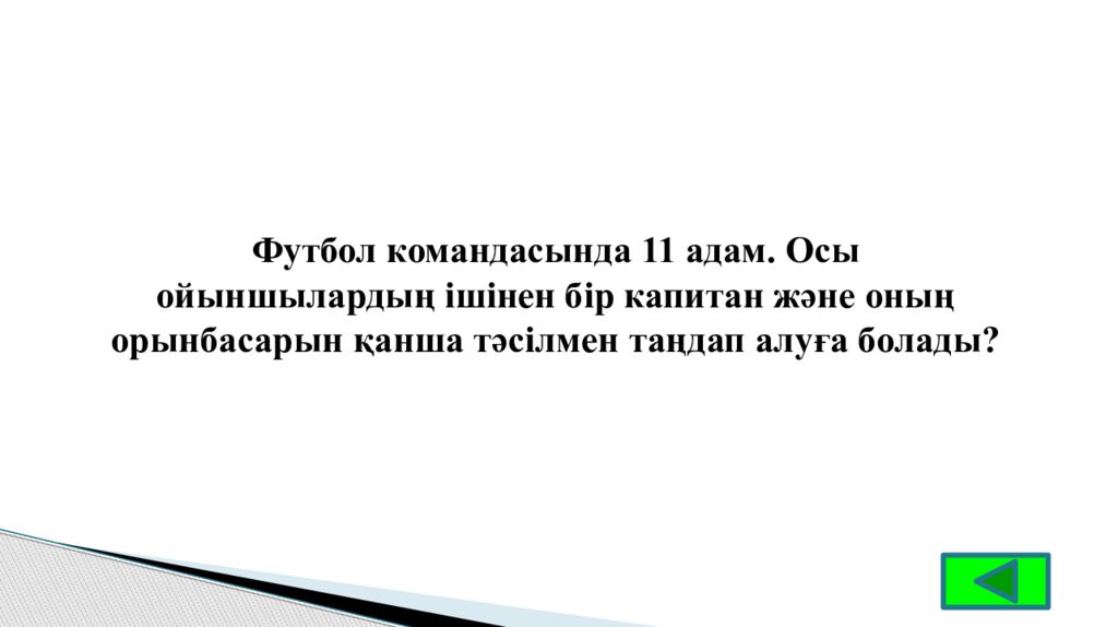 Футбол командасында 11 адам. Осы ойыншылардың ішінен бір капитан және оның орынбасарын қанша тәсілмен таңдап алуға болады ?