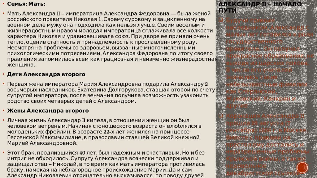Семья: Мать: Мать Александра II – императрица Александра Федоровна — была женой российского правителя Николая 1. Своему суровому и зацикленному на военном деле мужу она подходила как нельзя лучше. Своим веселым и жизнерадостным нравом молодая императрица сглаживала все колкости характера Николая и уравновешивала союз. При дворе ее приняли очень тепло, оценив статность и принадлежность к прославленному роду. Несмотря на проблемы со здоровьем, вызванные многочисленными психологическими потрясениями, Александра Федоровна по итогу своего правления запомнилась всем как грациозная и неизменно жизнерадостная женщина. Дети Александра второго Первая жена императора Мария Александровна подарила Александру 2 восьмерых наследников. Екатерина Долгорукова, ставшая второй по счету супругой императора, после венчания получила возможность узаконить родство своих четверых детей с Александром. Жены Александра второго Личная жизнь Александар II кипела, в отношении женщин он был человеком ветреным. Начиная с юношеского возраста он влюблялся в молоденьких фрейлин. В возрасте 22-х лет женился на принцессе Гессенской Максимилиане, в православии ставшей Великой княжной Марией Александровной. Этот брак, продлившийся 40 лет, был надежным и счастливым. Но и без интриг не обходилось. Супругу Александра всячески поддерживал и защищал отец – Николай, в то время как мать императора противилась браку, намекая на неблагородное происхождение Марии. Да и сам Александр Николаевич отрицательно высказывался по поводу друзей жены, а также ее «душного» характера. После смерти супруги император связал себя брачными узами с ближайшей своей фавориткой – княжной Екатериной Долгоруковой. Будучи прямым наследником, Александр с малых лет готовился к роли государственного правителя. Он получал прекрасное образование, не выходя из царских покоев. В числе его учителей значились такие небезызвестные фамилии как Сперанский, Жуковский, Канкрин и другие Коронация Александра II прошла 26 августа (7 сентября) 1856 г. в Москве. Вместе с правами на престол ему достались и неразрешенные проблемы Крымской войны, а также недовольное декабристской ссылкой 1825 года общество.