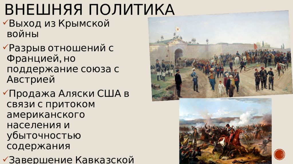 Выход из Крымской войны Разрыв отношений с Францией, но поддержание союза с Австрией Продажа Аляски США в связи с притоком американского населения и убыточностью содержания Завершение Кавказской войны в 1864 году Восстановление российского флота на Черном море